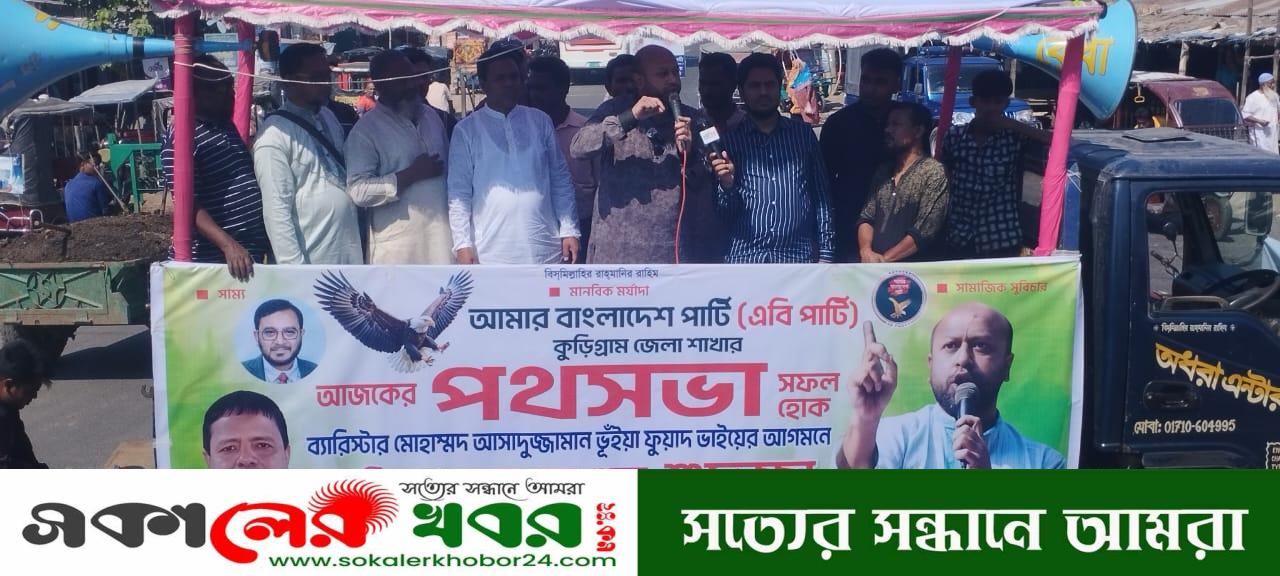সাম্য, মানবিক মর্যাদা ও সামাজিক সুবিচার এই তিন মূলনীতির ভিত্তিতে অধিকার ভিত্তিক কল্যাণ রাষ্ট্র প্রতিষ্ঠার লক্ষ্যে কুড়িগ্রামে আমার বাংলাদেশ পার্টির (এবি পার্টি) সাধারন সম্পাদক ব্যারিস্টার আসাদুজ্জামান ফুয়াদের পথ