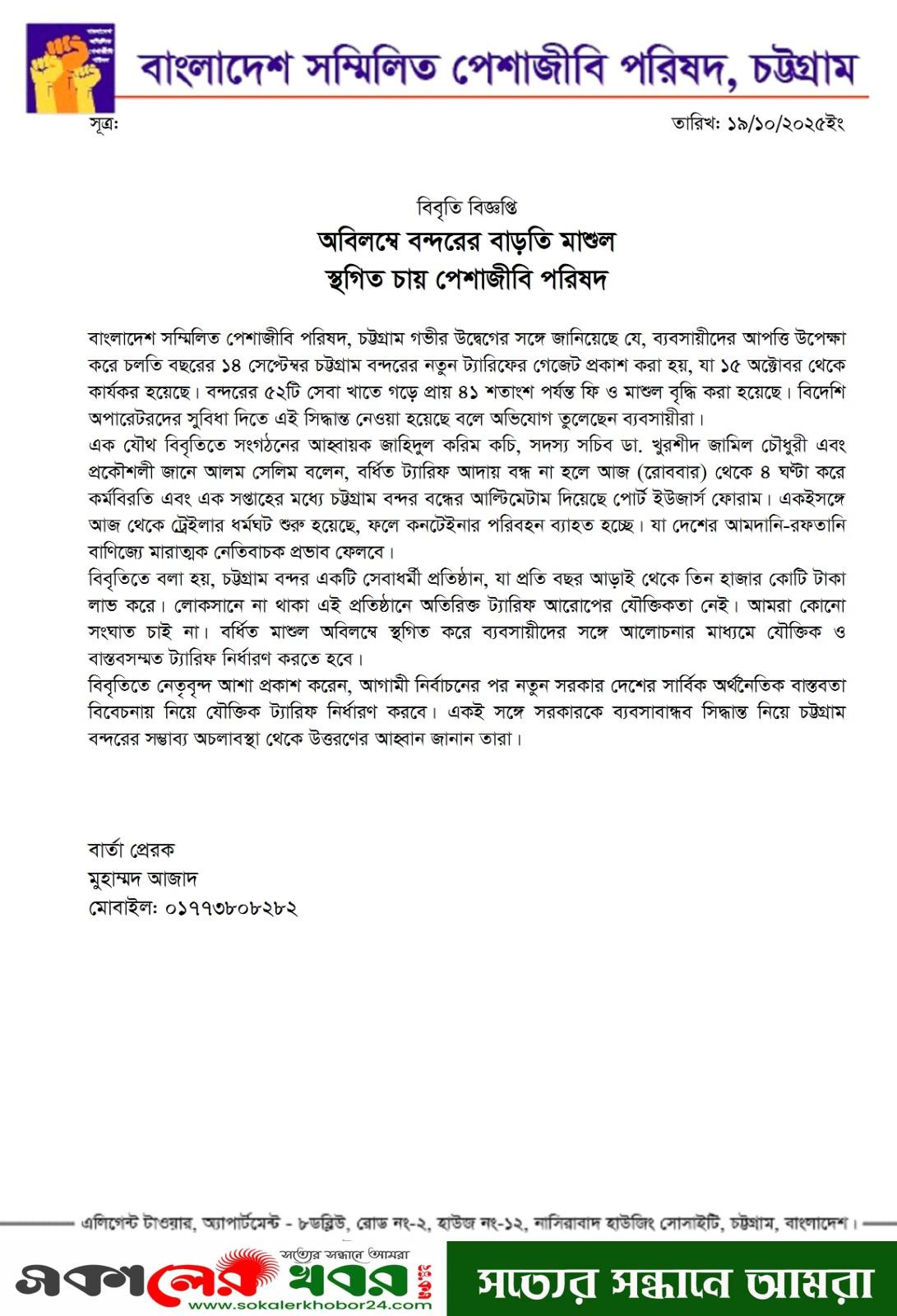 চট্টগ্রাম ব্যুরো :বাংলাদেশ সম্মিলিত পেশাজীবি পরিষদ, চট্টগ্রাম গভীর উদ্বেগের সঙ্গে জানিয়েছে যে, ব্যবসায়ীদের আপত্তি উপেক্ষা করে চলতি বছরের ১৪ সেপ্টেম্বর চট্টগ্রাম বন্দরের নতুন ট্যারিফের গেজেট প্রকাশ করা হয়, যা ১৫ অক্টোবর থেকে কার্যকর হয়েছে। বন্দরের ৫২টি সেবা খাতে গড়ে প্রায় ৪১ শতাংশ পর্যন্ত ফি ও মাশুল বৃদ্ধি করা হয়েছে। বিদেশি অপারেটরদের সুবিধা দিতে এই সিদ্ধান্ত নেওয়া হয়েছে বলে অভিযোগ তুলেছেন ব্যবসায়ীরা।