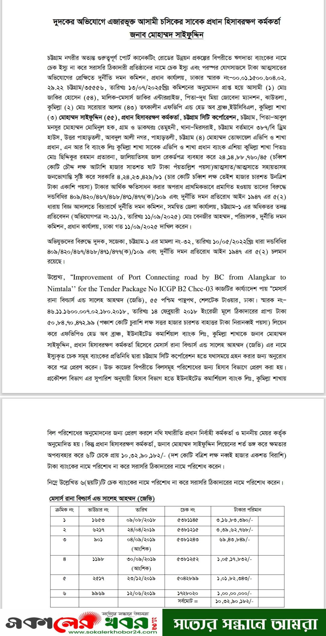 ইমপ্রুভমেন্ট পোর্ট কানেকটিং রোড প্রকল্পের (অলংকার থেকে নিমতলা পর্যন্ত) কাজে প্রায় সাড়ে ৪ কোটি টাকার ক্ষতিসাধন ও জালিয়াতির মাধ্যমে ব্যাংক ঋণ আত্মসাতের অভিযোগে এ চার্জশিট দাখিল করেন দুর্নীতি দমন কমিশনের (দুদক) প্রধান কার্যালয়ের পরিচালক ও তদন্ত কর্মকর্তা মো. বেনজীর আহম্মদ।